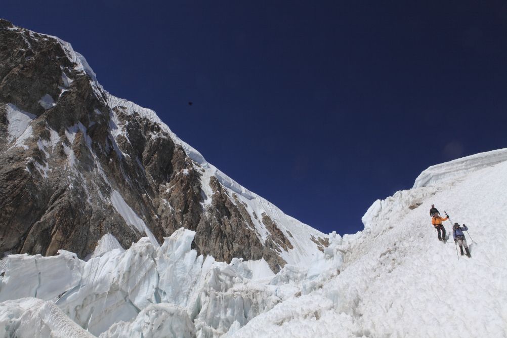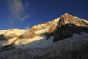Départ vers 2h00 du matin pour remonter le glacier. Le cheminement n'est pas toujours évident, et nous sommes obligé de contourner des zones de crevasses et de séracs. Puis nous arrivons au pied de la pente menant au col. Elle fait 300 m de haut à 50/55° environ. Nous la remonterons à l'aide de cordes fixes. C'est ensuite l'arête finale, assez raide au début, mais qui se couche légèrement avant le sommet. Un petit mur à 60° permet d'atteindre l'arête sommitale que nous suivrons jusqu'au sommet. Descente par le même itinéraire puis en rappel pour rejoindre le glacier. Retour au camp 1 et nuit sur place. Repas froid à midi. Campement