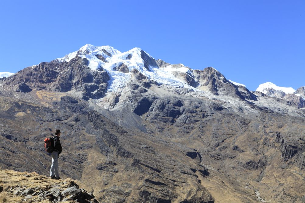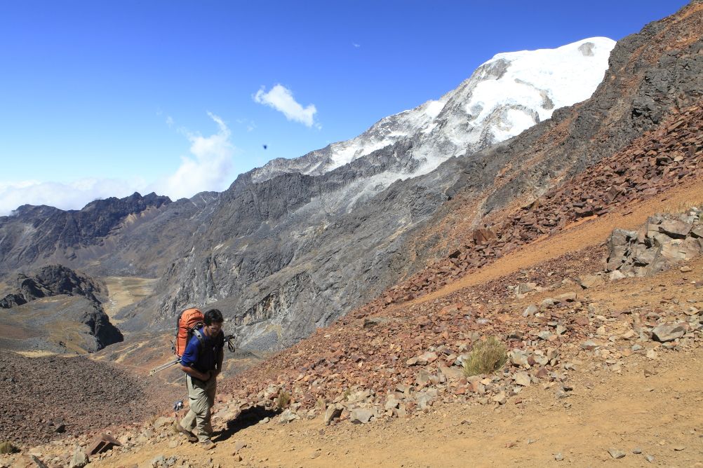 Nous entamons notre montée en direction d’un premier col très large situé à 4980m. Puis nous descendons dans une première vallée (4870m), montons à un deuxième col (4980m), puis descente dans une deuxième vallée ( 4785m) avant de gravir le dernier col à 4920m. La vue sur l’Ancohuma se dégage et nous sommes alors entourés de glaciers majestueux. Nous arrivons non loin de la laguna San Fransisco, où nous pourrons profiter des eaux thermales non loin de là.