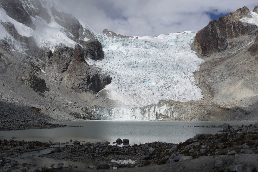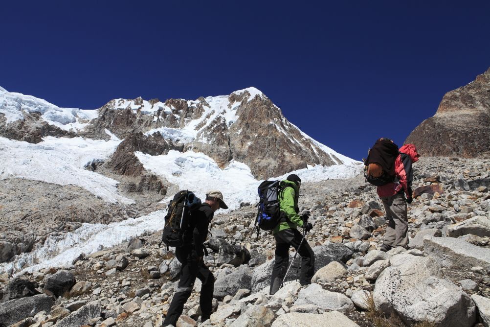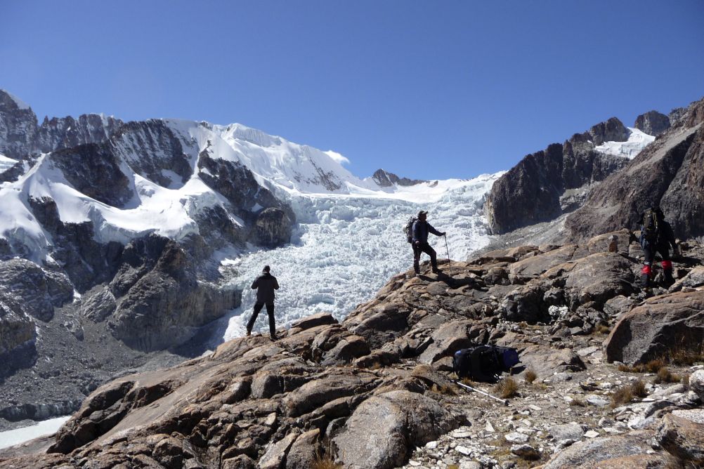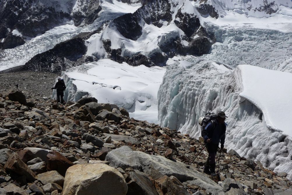 On contourne la lagune par la droite en direction de la langue glaciaire. Montée par un chemin escarpé à flanc de rocher pour rejoindre un plateau au bord du glacier. Poursuite sur les rochers tout en longeant la langue glaciaire. Passage délicat dans les rochers avant d’arriver au bord du glacier (5460 m alt.). Campement au bord du glacier.