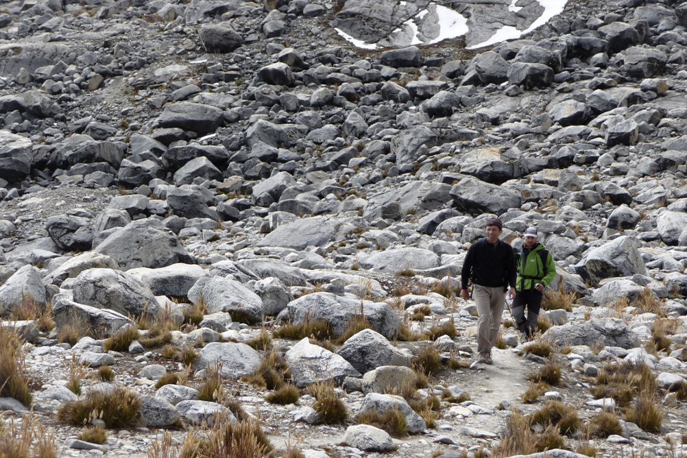 Nous descendons tranquillement par le chemin le long de la moraine puis à travers les grandes dalles rocheuses, pour retrouver notre camp de base. Campement.