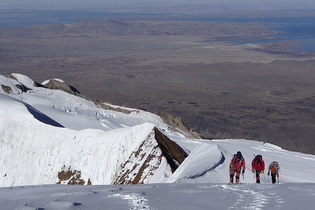 Départ très tôt le matin pour remonter le plateau glaciaire puis le long glacier menant sous le sommet. Une petite section plus raide à 45° mène à l'arête sommitale que nous remontons jusqu'au sommet. Splendide vue sur le lac Titicaca et l'illampu juste à côté de nous. Nous pourrons observer la voie d'ascension menant au sommet de ce dernier. La descente peut se faire en traversant le sommet et en descendant par un autre itinéraire, pour rejoindre plus bas le glacier lui même. Redescente à la Laguna Glaciar.