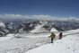 Grosse journée, en altitude. Après avoir rejoint l'arête faisant la jonction avec la face ouest, par une longue traversée, nous montons encore un peu pour arriver à la cabane Independencia à 6380 m située sur une sorte de petit col. C'est ensuite à nouveau une traversée ascendante pour attaquer la Canaleta, long et large couloir d’éboulis facile, mais particulièrement pénible pour atteindre le sommet à 6959 m. Selon l’époque de l’année, celui-ci peut être enneigé, et donc plus commode à remonter. Du sommet la vue s’étend de l’océan pacifique vers le Chili, Santiago, jusqu’aux plaines immenses de la pampa en Argentine et tous les sommets proches de la cordillère. Descente par la même voie jusqu’à notre camp et nuit au camp.