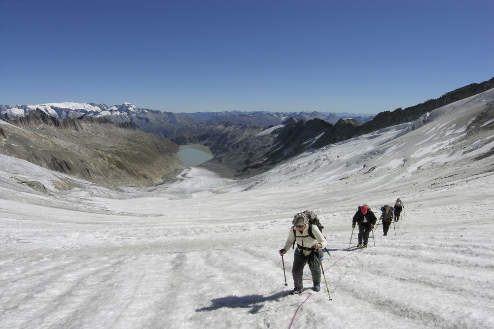 Au passage, nous admirerons le glacier de l'Aar, troisième plus grand glacier des Alpes, dominé par les faces du Finsteraarhorn, du Lauteraarhorn, et du Schreckhorn.