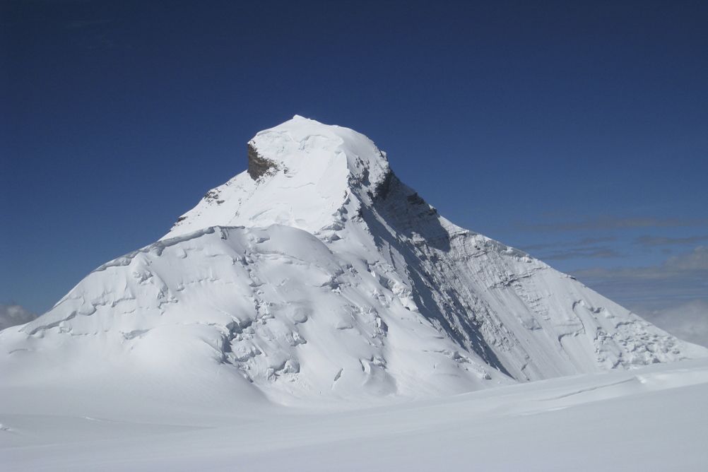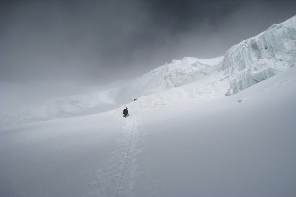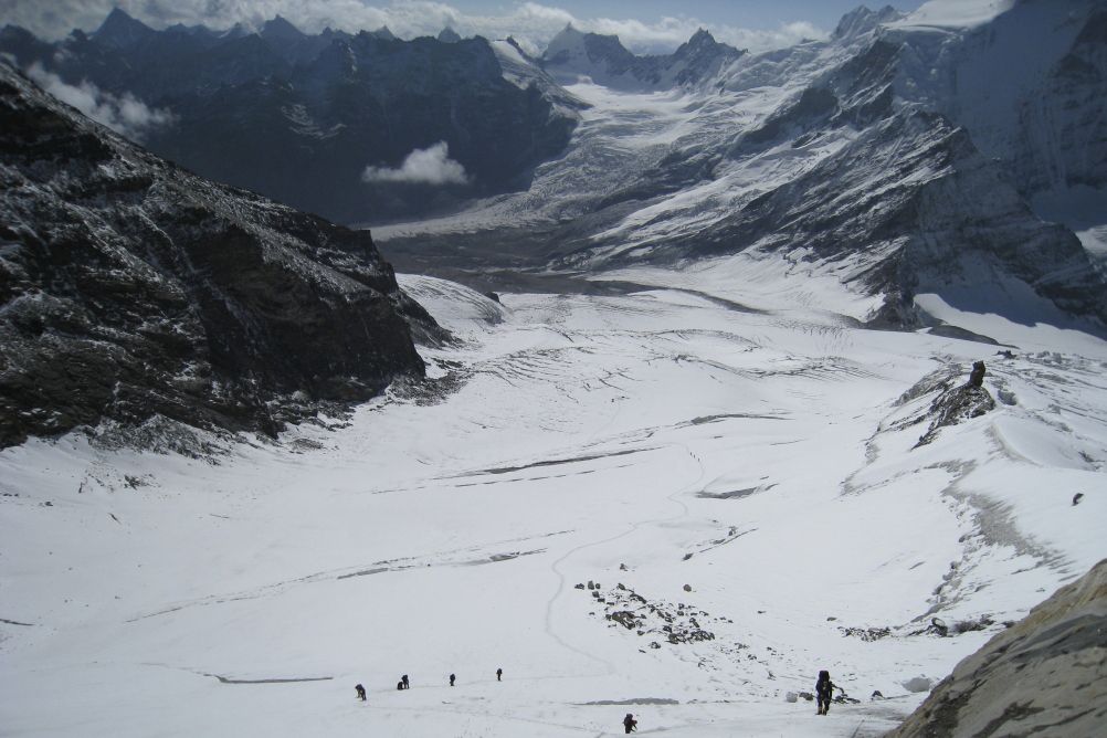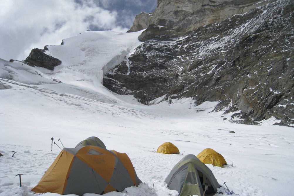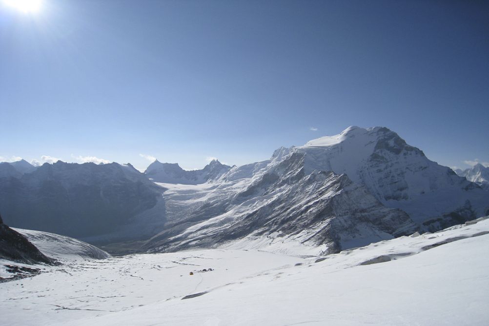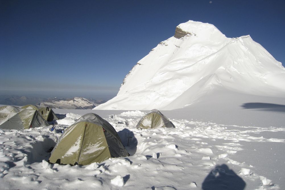 Tentative d'ascension du sommet par l'arête est, sur un glacier suspendu présentant parfois des passages raides. Certain passages peuvent être à 60° sur de courtes distances, sinon en général à 30-35°, et la partie terminale à 45°. 10 à 13h de marche pour l''ascension et le retour au camp 3.