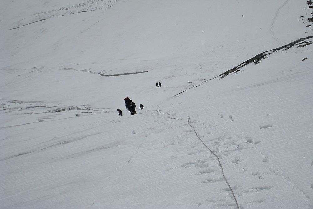 Ascension peu difficile dans l’ensemble, avec quelques ressauts à 45°, qui seront équipés de cordes fixes. Vous devez être capable d’évoluer en cordée autonome dans ce genre de difficulté, comparable à la traversée des trois Mont-Blanc.