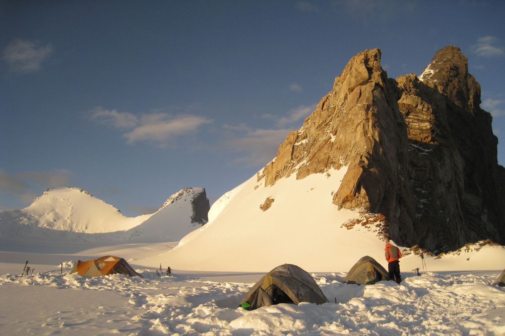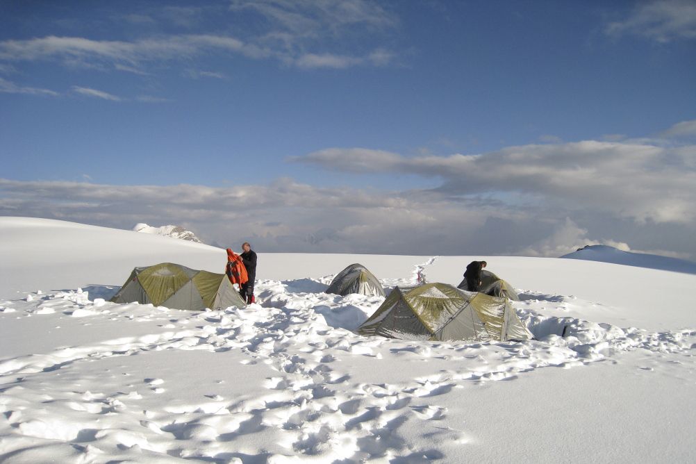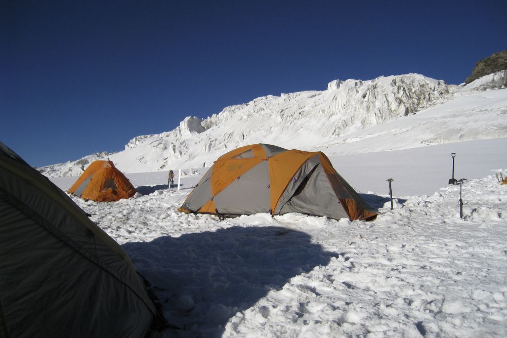 Si les conditions le permettent, progression par la voie dite "des Autrichiens", sur une grande pente de neige d''environ 300 m à 40/45°. Sinon, nous emprunterons l''itinéraire suivi par les premiers ascensionnistes, qui passe sous la face est du White Needle : une vaste pente de neige de 35 à 40°. Dans les 2 cas, les pentes seront équipées de cordes fixes. Installation du camp 2 sur le superbe Snow Plateau (7h de montée du camp 1 au camp 2).