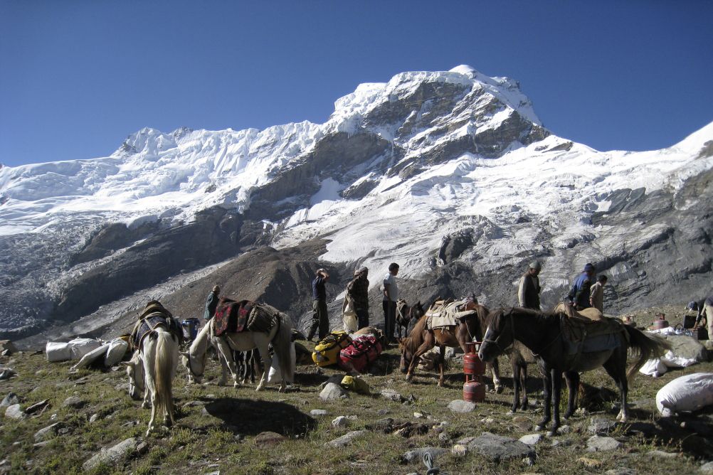 Portage au camp 1. Montée sur la moraine du glacier de Shafat, puis sur le glacier lui-même. (4h de marche du camp de base au camp 1 AR).