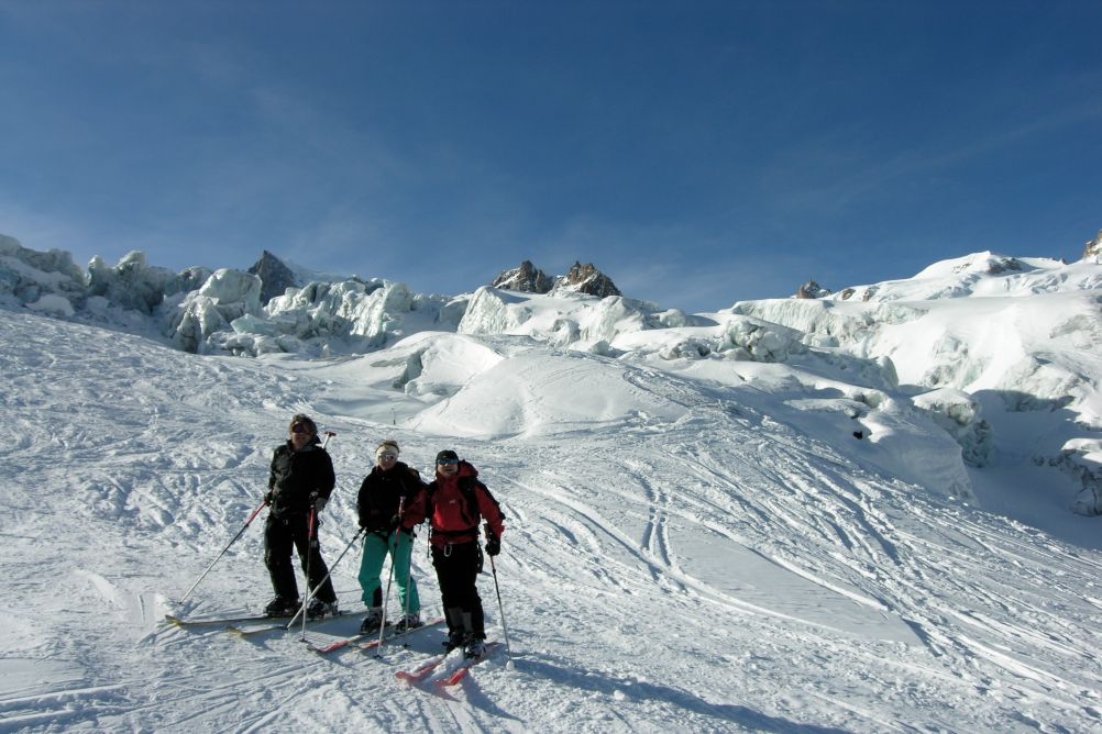 Depuis l'aiguille du Midi, nous partirons sur le glacier du Géant avec mise en situation. Encordement sur glacier. Comment enrayer la chute en crevasse, avec les skis ! Réalisation d’un amarrage en neige et d’un mouflage et / ou remontée sur corde fixe, avantage et inconvénient. Type de corde utilisée sur glacier et combien ? Progression encordée à la descente par mauvais temps, règles de sécurité, consignes, difficultés de progression en terrain glaciaire.