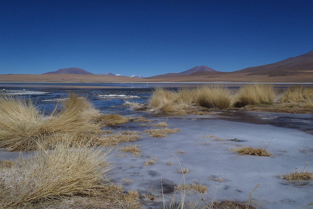 Arrêt aux eaux thermales de Polques (4000 m) et traversée du désert de Dali (4750 m). Arrivée en fin de matinée à la Laguna Verde (4300 m) au pied du volcan Licancabur. L'après-midi, route jusqu'à la laguna Salada où la piste bifurque vers le nord qui conduit au village de Quetena. Arrivée à Quetena dans l'après-midi.